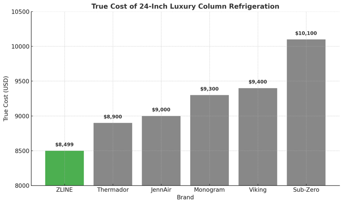 Most luxury brands price a 24-inch column refrigerator between $8,500 and $10,000 once panels and handles are included. ZLINE’s 24-inch Stainless Steel Column Refrigerator is priced at $8,499 with panels and handle included, making it one of the most attainable options on the market.