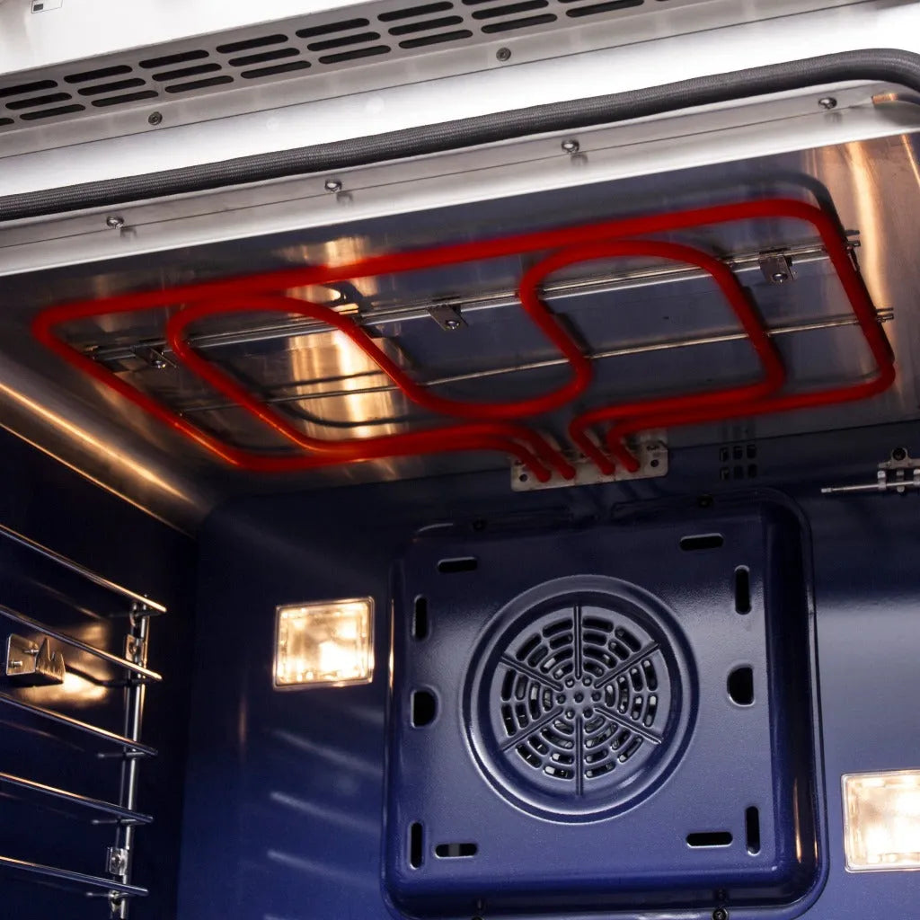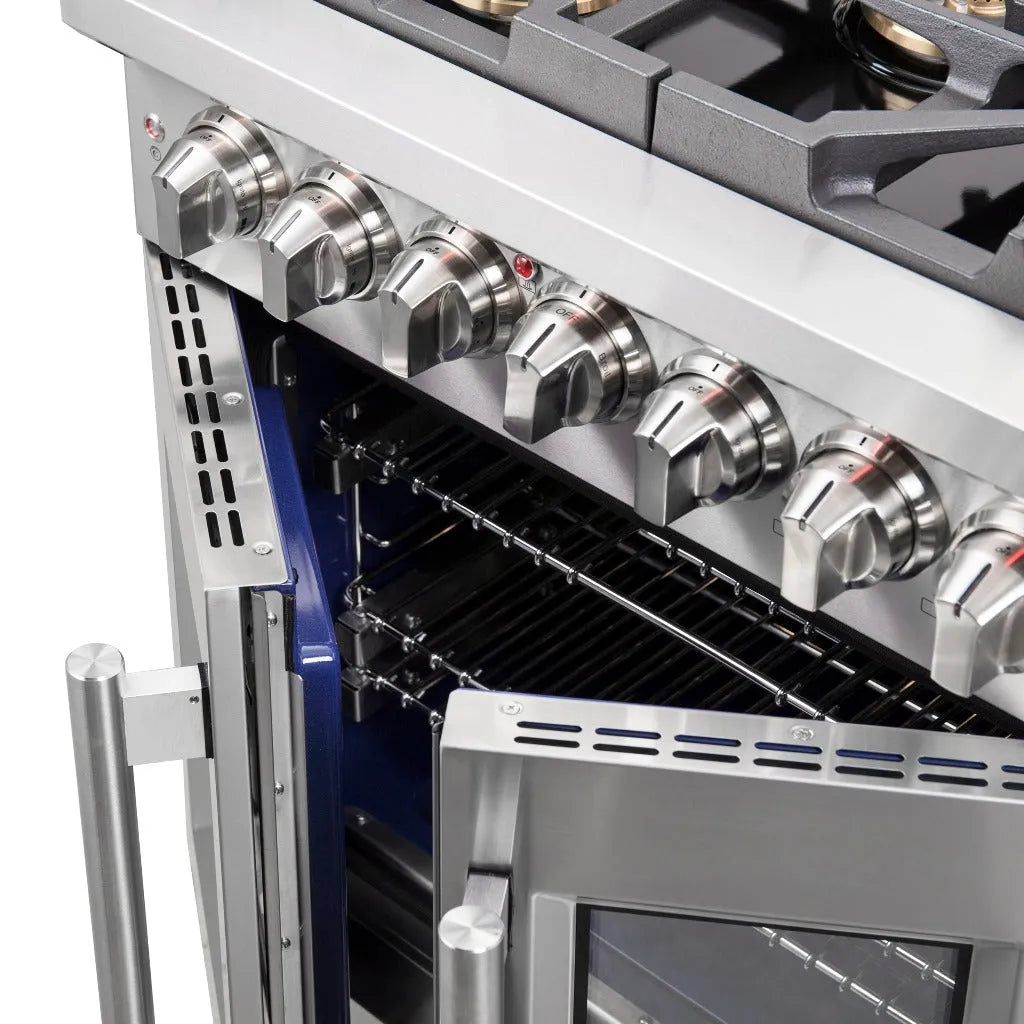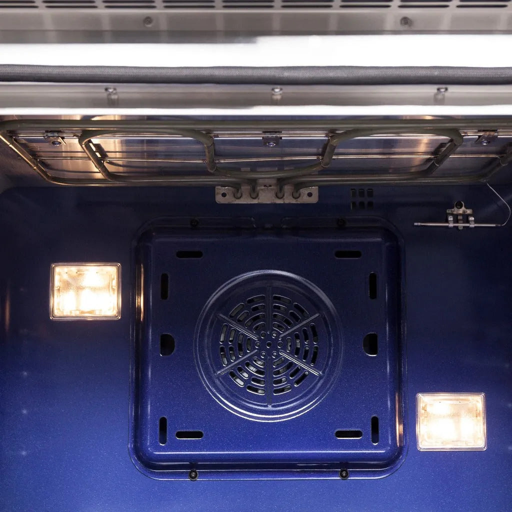 The 30” Forno Capriasca French Door Dual Fuel Range brings professional styling and quality into your home kitchen with its durable stainless-steel design. Unique French doors take up to 12 inches less open door space and easily open simultaneously with one hand. The gas rangetop has 5 sealed dual-ring brass burners with a total stove top output of 100,000 BTU for simmering delicate tasks like melting chocolate or cooking sauces, giving you the ability to cook up whatever delicious meals you desire. The heavy-duty continuous cast iron grates allow for even heat distribution and maximum stability of cookware mobility over a recessed enamel cooktop cavity, which keeps spills and splashes contained and makes the cookware easy to clean. The 4.32 cu. ft. electric oven with a total output of 6,300 Watts is encased in a speckled blue enamel interior fitted with a true convection fan, ensuring fast, precision, and consistent oven cooking. Along for easy viewing is a 3-layer glass oven door window. Included is an LP conversion kit, 3 stainless steel telescopic oven racks, wok-ring, reversible griddle, rotisserie kit, and skewer forks, air fry basket with rack and drip pan. Housed in a high-grade 304 stainless steel body and zinc-coated metal knobs and bezel, this unit sports a stylish look that is built to last.