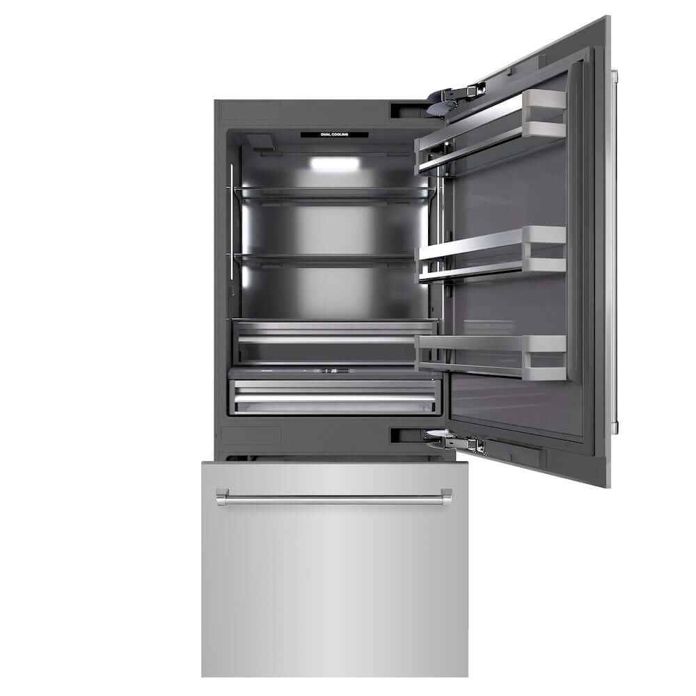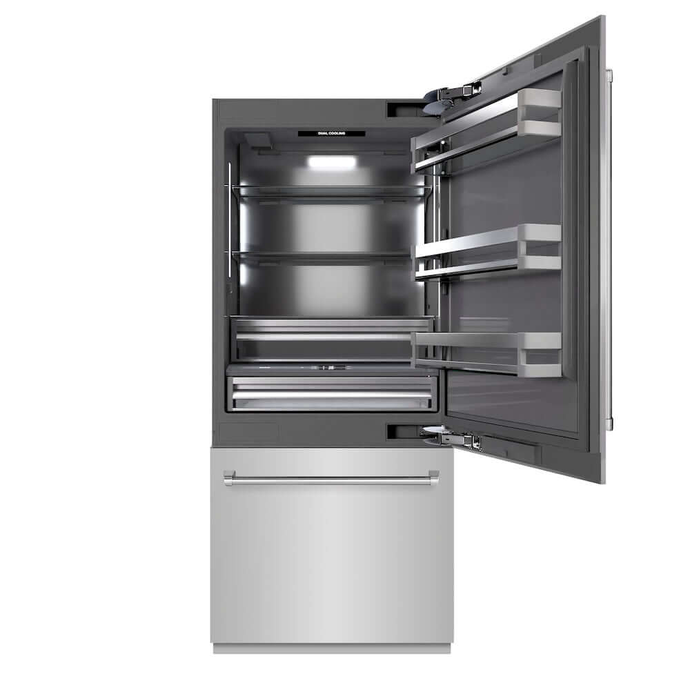 Luxury isn’t meant to be desired - it’s meant to be attainable. The ZLINE 36 in. 19.8 cu. ft. Built-In Bottom Freezer Refrigerator with Water Dispenser and Ice Maker in Stainless Steel with Graphite Gray Interior (GRBIT-304-36) provides the ultimate upgrade to the center of your home by pairing premium dual cooling technology with enhanced storage capacity for multiple grocery items. Achieve ZLINE Attainable Luxury® excellence with innovative features designed to enhance your kitchen’s cooling and freezing capability.