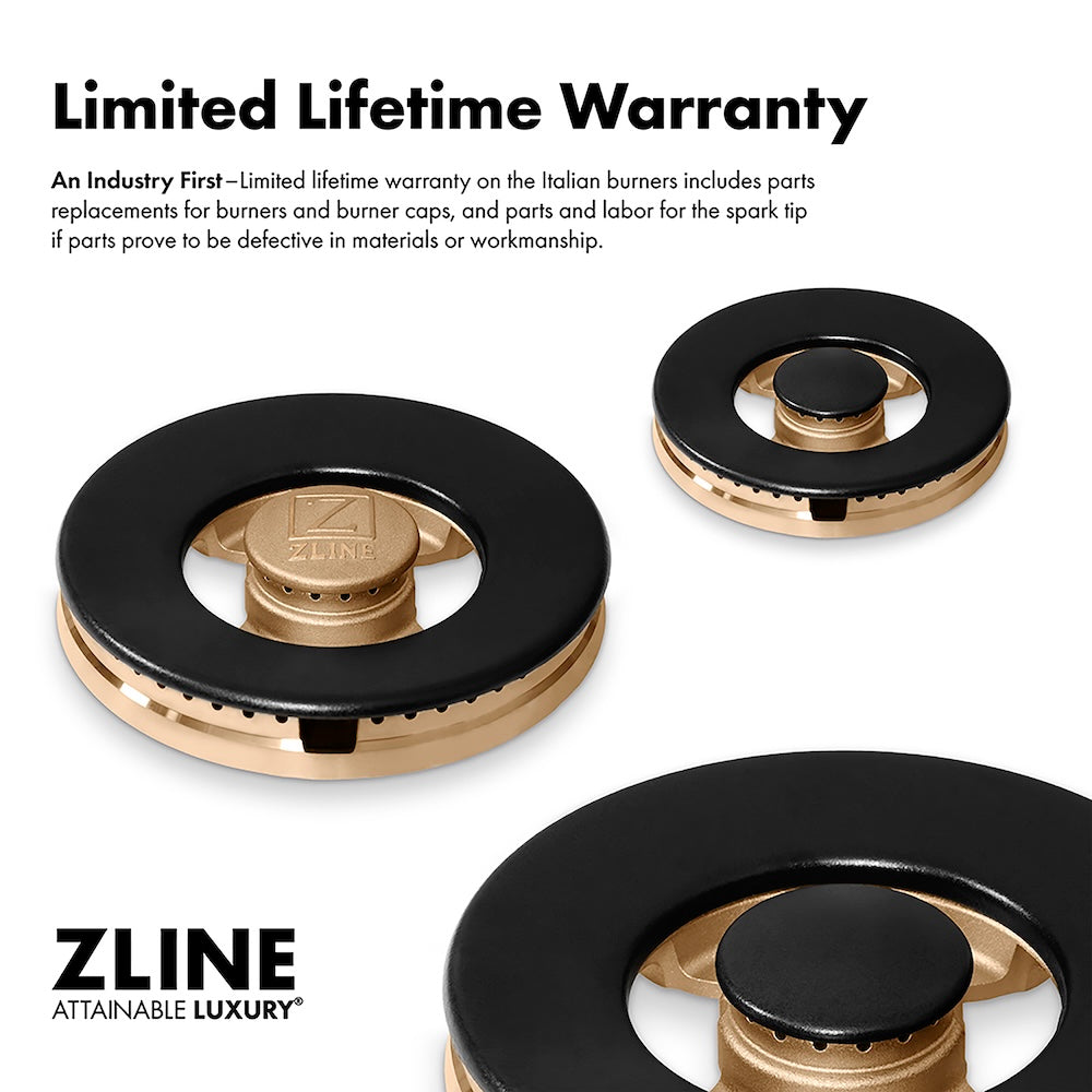 - Industry First Lifetime Burner Warranty - Limited lifetime warranty on ZLINE Italian burners includes part replacements for burners and burner caps, and parts and labor for spark tips if parts prove to be defective in materials or workmanship