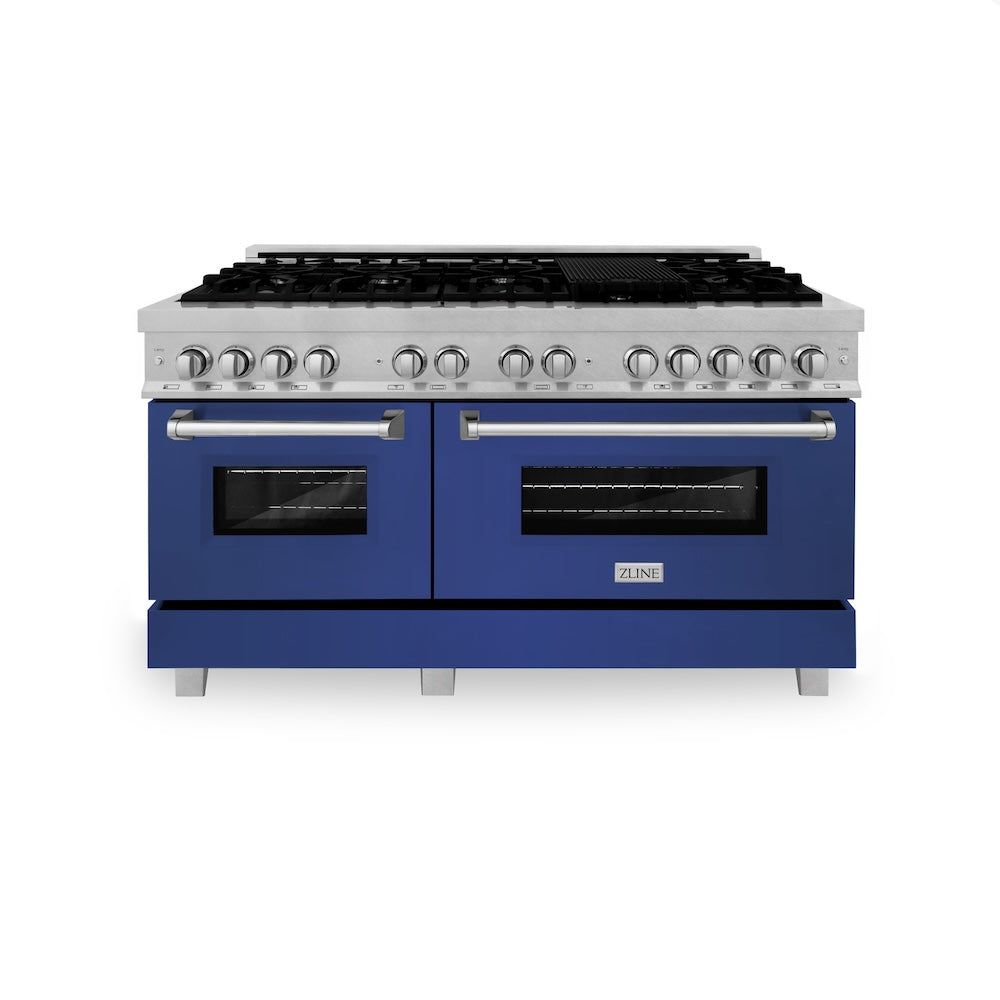 Luxury isn’t meant to be left desired—it’s meant to be attainable. The ZLINE 60 in. 7.4 cu. ft. Legacy Dual Fuel Range with 9 Burner Gas Cooktop and 2 Electric Convection Ovens in Satin Stainless Steel and Blue Matte Doors (RAS-BM-60) pairs a powerful gas cooktop with 9 Italian-crafted burners, dual electric convection ovens, and beautiful blue matte doors with Landscape window designs. With innovative features designed to enhance your kitchen’s capability, ZLINE Legacy Dual Fuel Ranges provide a professional culinary experience by pairing unmatched performance with timeless style.
