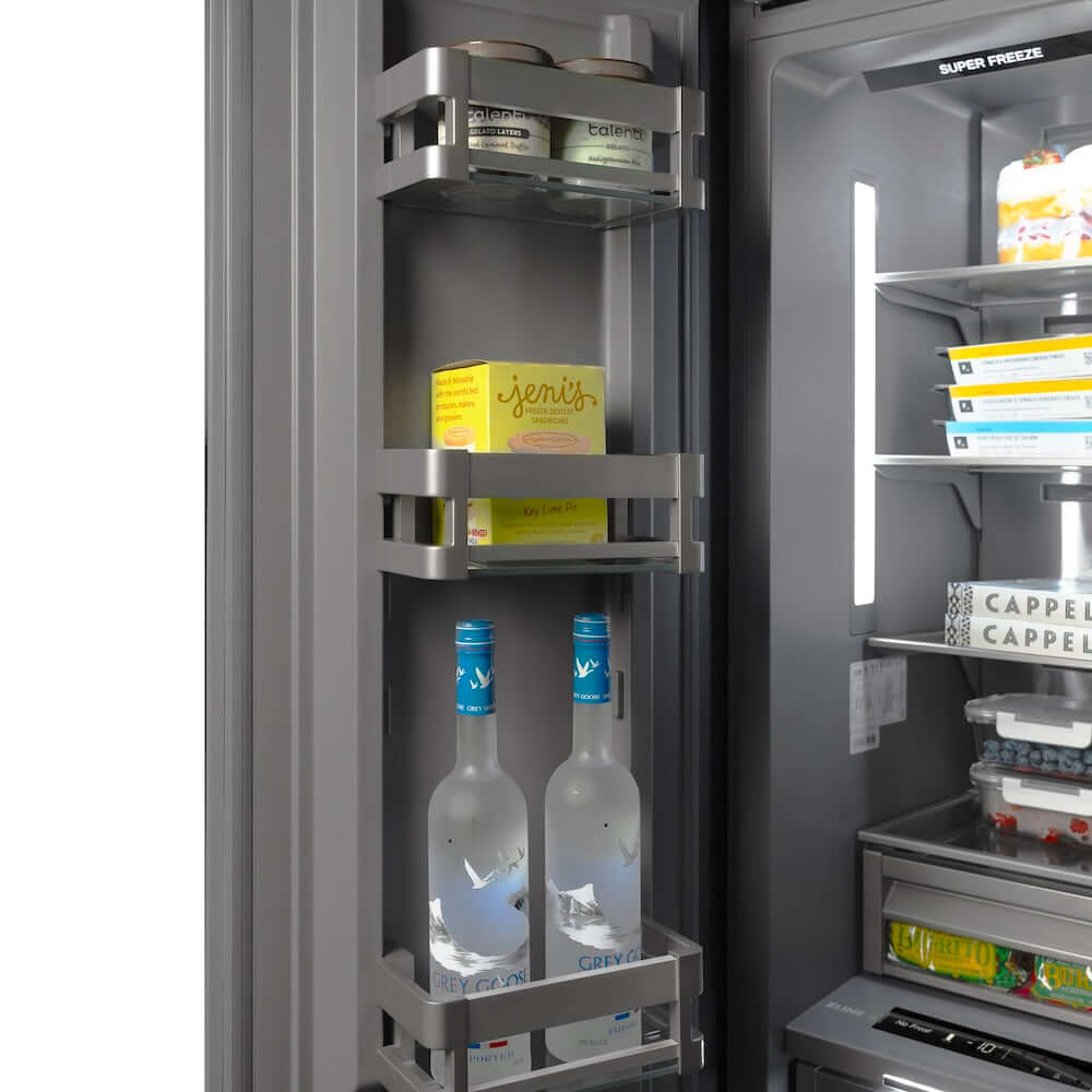 - Flexible Door Bins - Store frozen foods, containers, and other taller items inside 3 height-adjustable tempered glass door bins with a stainless steel trim