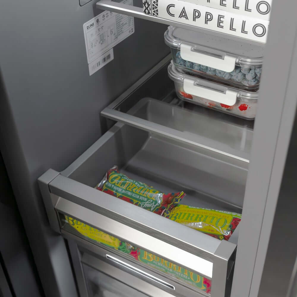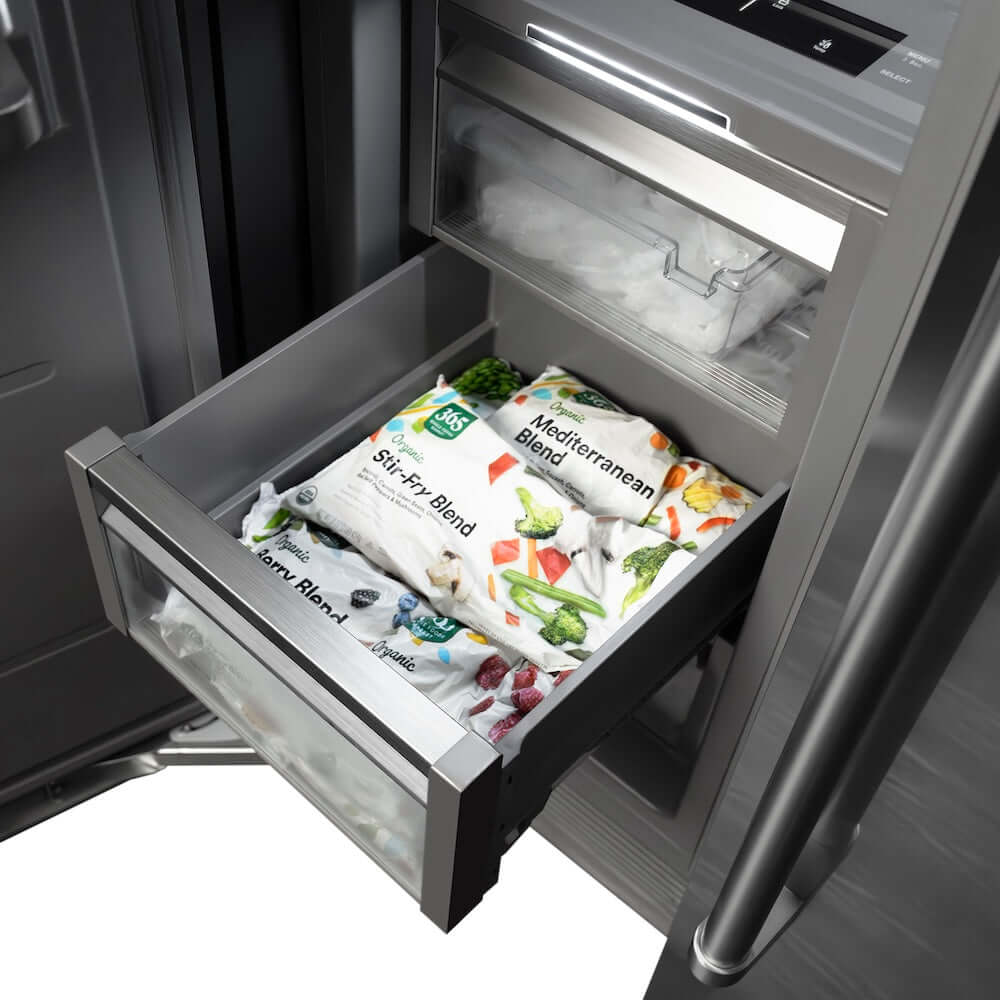 - Multiple Drawer Options - Organize frozen food and shorter items inside 1 small full-width drawer or taller items inside 2 large full-width drawers