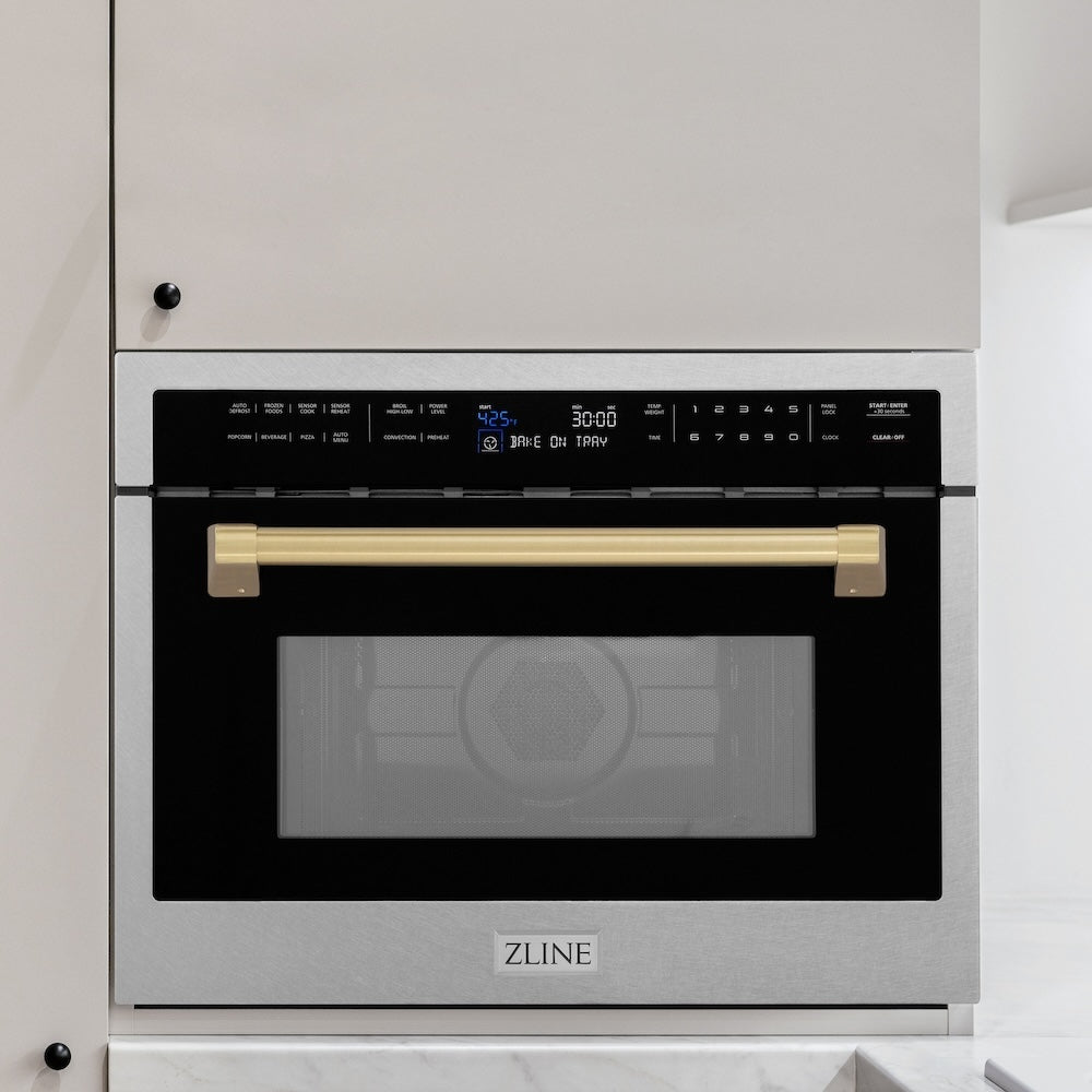 Luxury isn’t meant to be left desired—it’s meant to be attainable. The ZLINE Autograph Edition 24 in. 1.6 cu ft. Built-in Convection Microwave Oven in Satin Stainless Steel with Champagne Bronze Accents (MWOZ-24-SS-CB) provides a professional culinary experience by pairing everyday convenience with a timeless style. Achieve ZLINE Attainable Luxury® excellence with unrivaled performance designed to enhance your kitchen’s capability.