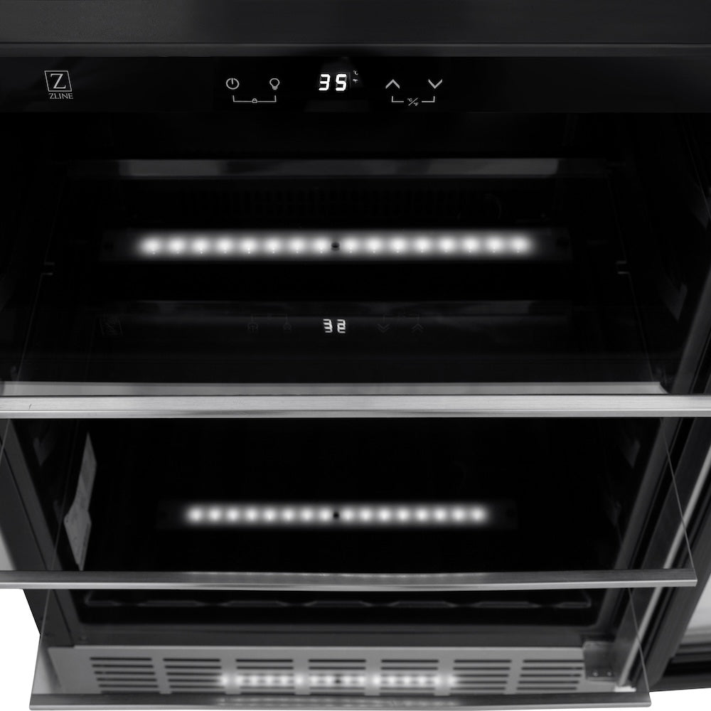 - ZLINE Autograph Edition 24 in. Monument Dual Zone 44-Bottle Wine Cooler in Stainless Steel with Champagne Bronze Accents (RWVZ-UD-24-CB)