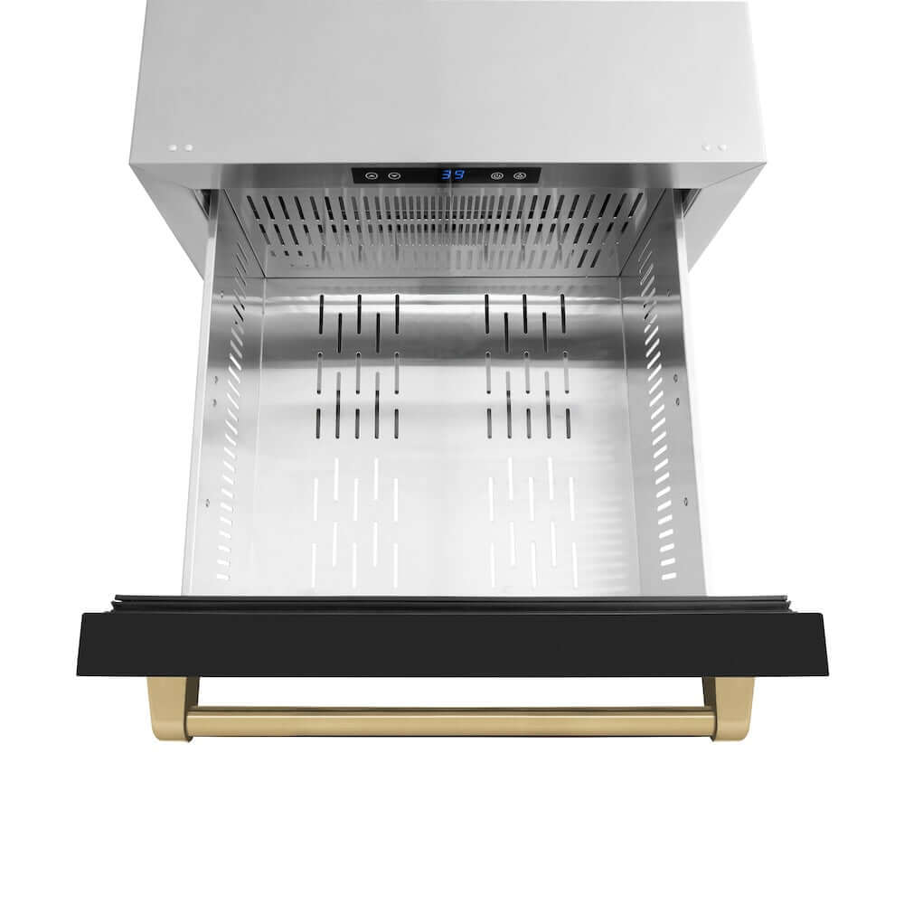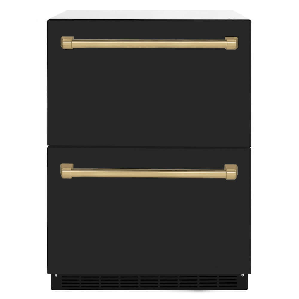 Luxury isn’t meant to be desired - it’s meant to be attainable. The ZLINE Autograph Edition 24 in. Touchstone 168 Can Outdoor-Rated Dual Refrigerator Drawer with Black Matte Doors and Champagne Bronze Handles (RDSOZ-BLM-24-CB) features state-of-the-art cooling technology, dual smooth glide soft-closing drawers, and an expansive interior capable of holding multiple beverages. Designed with a fully wrapped, anti-sweat stainless steel exterior and durable black matte doors perfect for indoor or outdoor installation, ZLINE Autograph Edition Touchstone Refrigerator Drawers are masterfully crafted to let you host parties of any size for any occasion.