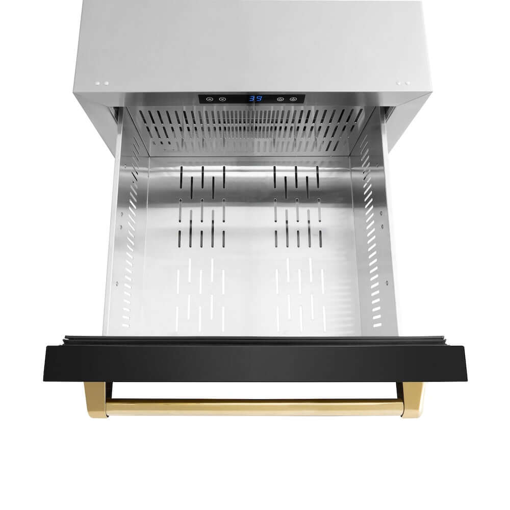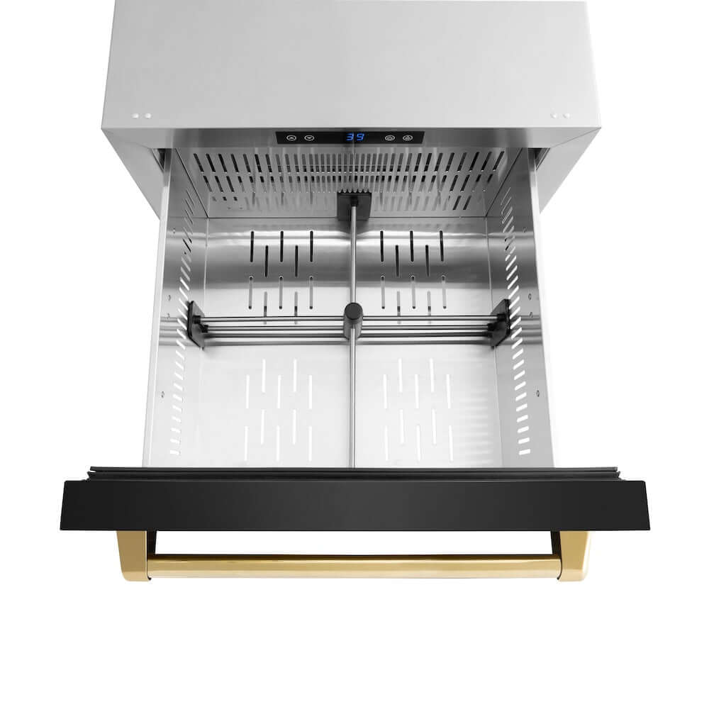 Luxury isn’t meant to be desired - it’s meant to be attainable. The ZLINE Autograph Edition 24 in. Touchstone 168 Can Outdoor-Rated Dual Refrigerator Drawer with Black Stainless Steel Doors and Polished Gold Handles (RDSOZ-BS-24-G) features state-of-the-art cooling technology, dual smooth glide soft-closing drawers, and an expansive interior capable of holding multiple beverages. Designed with a fully wrapped, anti-sweat stainless steel exterior and durable black stainless steel doors perfect for indoor or outdoor installation, ZLINE Autograph Edition Touchstone Refrigerator Drawers are masterfully crafted to let you host parties of any size for any occasion.