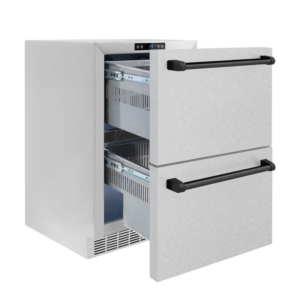 Luxury isn’t meant to be left desired—it’s meant to be attainable. The ZLINE Autograph Edition 24 in. Touchstone 168 Can Outdoor-Rated Dual Refrigerator Drawer with Satin Stainless Steel Doors and Matte Black Handles (RDSOZ-SN-24-MB) features state-of-the-art cooling technology, dual smooth glide soft-closing drawers, and an expansive interior capable of holding multiple beverages. Designed with a fully wrapped, anti-sweat stainless steel exterior and durable Satin Stainless Steel doors perfect for indoor or outdoor installation, ZLINE Autograph Edition Touchstone Refrigerator Drawers are masterfully crafted to let you host parties of any size for any occasion.