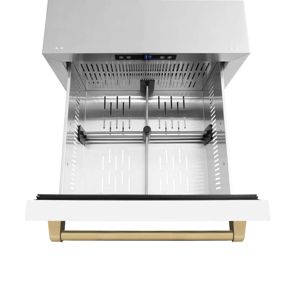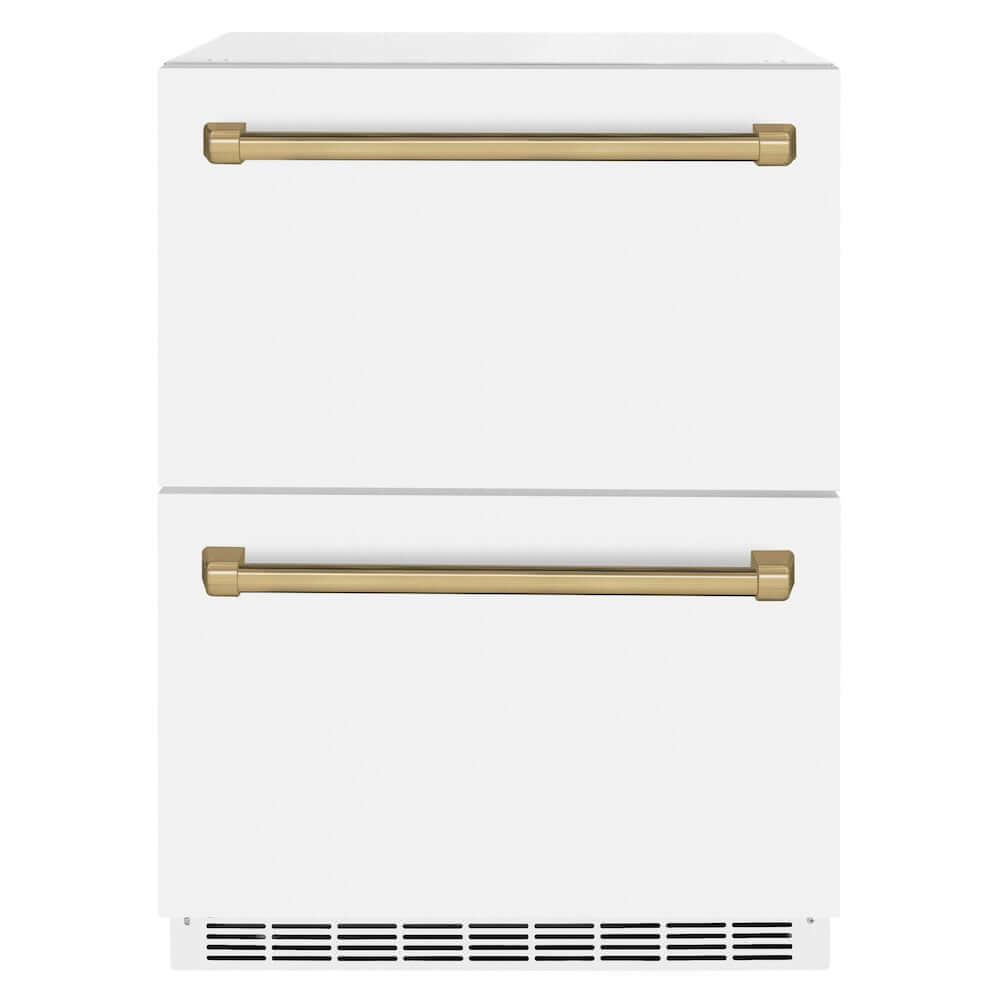 Luxury isn’t meant to be desired - it’s meant to be attainable. The ZLINE Autograph Edition 24 in. Touchstone 168 Can Outdoor-Rated Dual Refrigerator Drawer with White Matte Doors and Champagne Bronze Handles (RDSOZ-WM-24-CB) features state-of-the-art cooling technology, dual smooth glide soft-closing drawers, and an expansive interior capable of holding multiple beverages. Designed with a fully wrapped, anti-sweat stainless steel exterior and durable white matte doors perfect for indoor or outdoor installation, ZLINE Autograph Edition Touchstone Refrigerator Drawers are masterfully crafted to let you host parties of any size for any occasion.