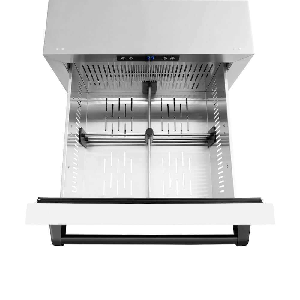 - LED Illumination - Illuminate the expansive interior of both drawers with 2 full-length cool white lights that can be set to display for up to 6 hours with or without drawers open