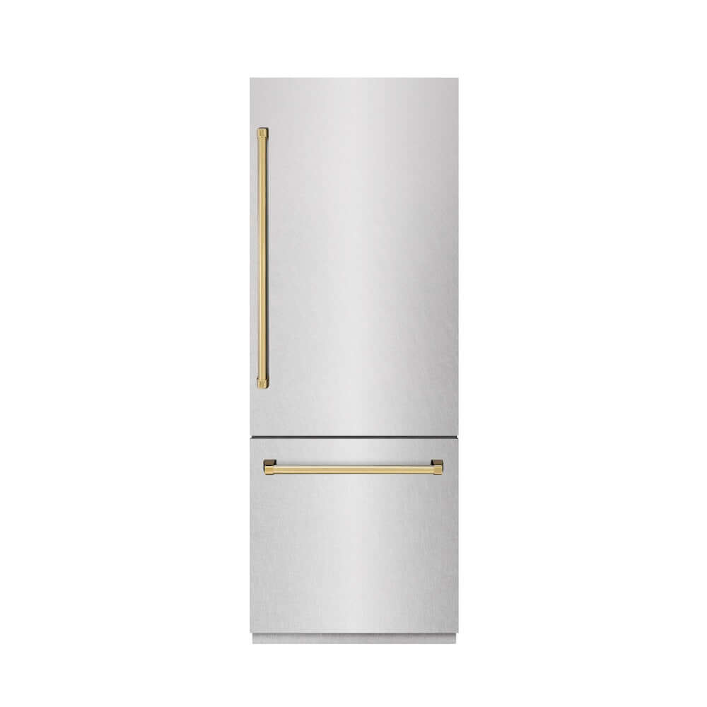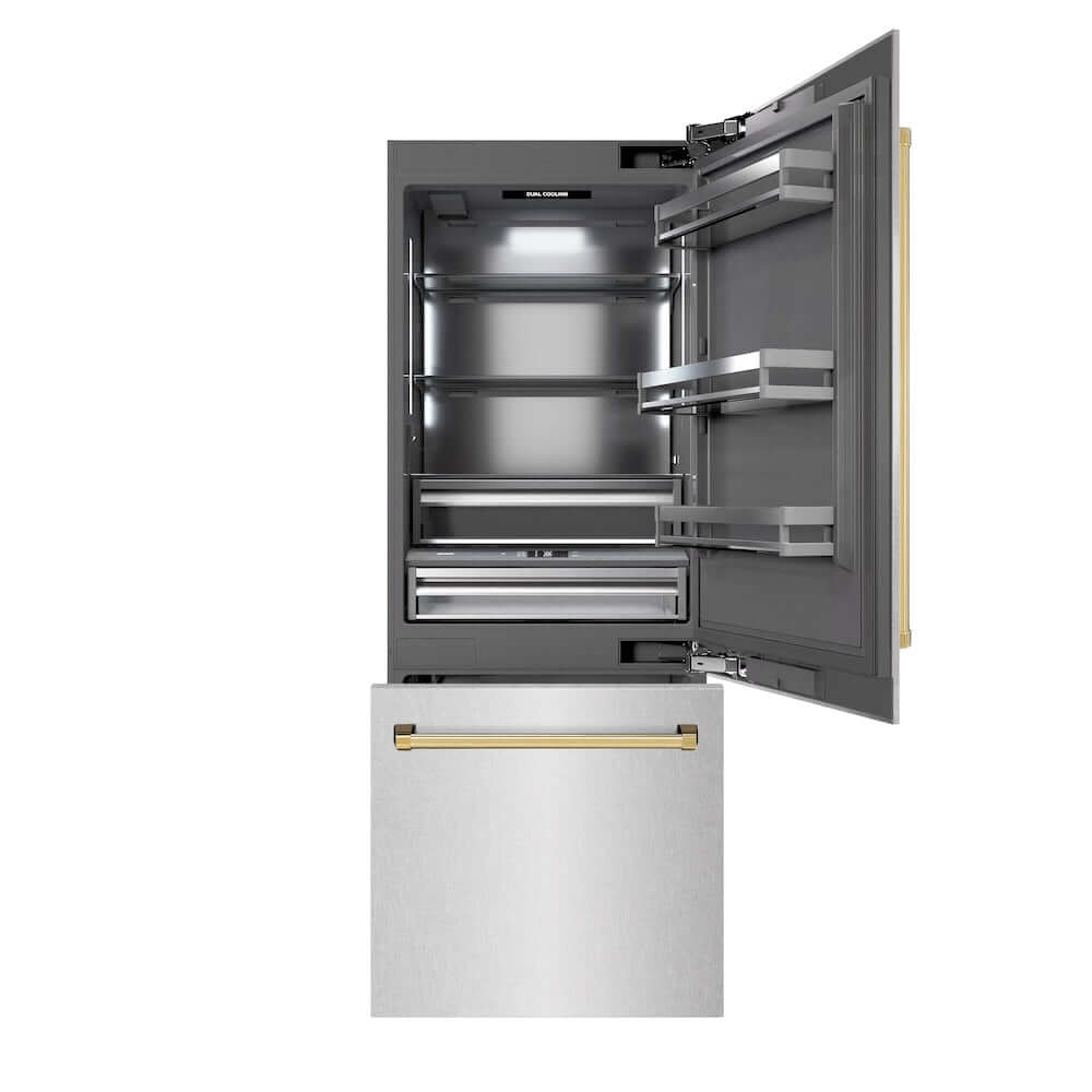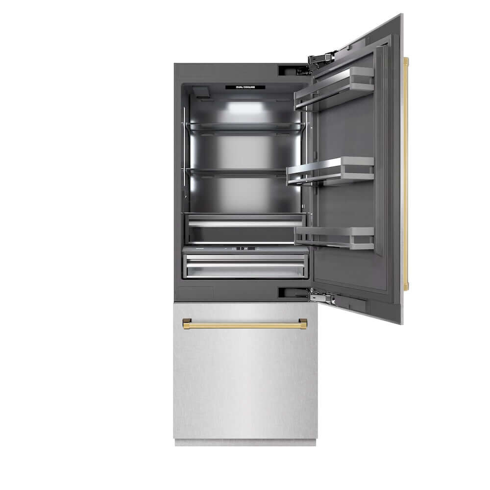Luxury isn’t meant to be left desired—it’s meant to be attainable. The ZLINE Autograph Edition 30 in. 16.1 cu. ft. Built-In Bottom Freezer Refrigerator with Water Dispenser and Ice Maker in Satin Stainless Steel with Graphite Gray Interior and Polished Gold Accents (GRBIVZ-SN-30-G) provides the ultimate upgrade to the center of your home by pairing premium dual cooling technology with enhanced storage capacity for multiple grocery items. Achieve ZLINE Attainable Luxury® excellence with innovative features designed to enhance your kitchen’s cooling and freezing capability.