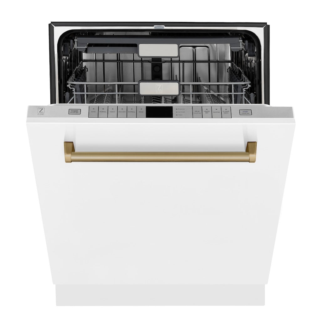 ZLINE Autograph Edition 24 in. Monument Series 3rd Rack Top Touch Control Tall Tub Dishwasher in White Matte with Champagne Bronze Handle, 45dBa (DWMTZ-WM-24-CB)