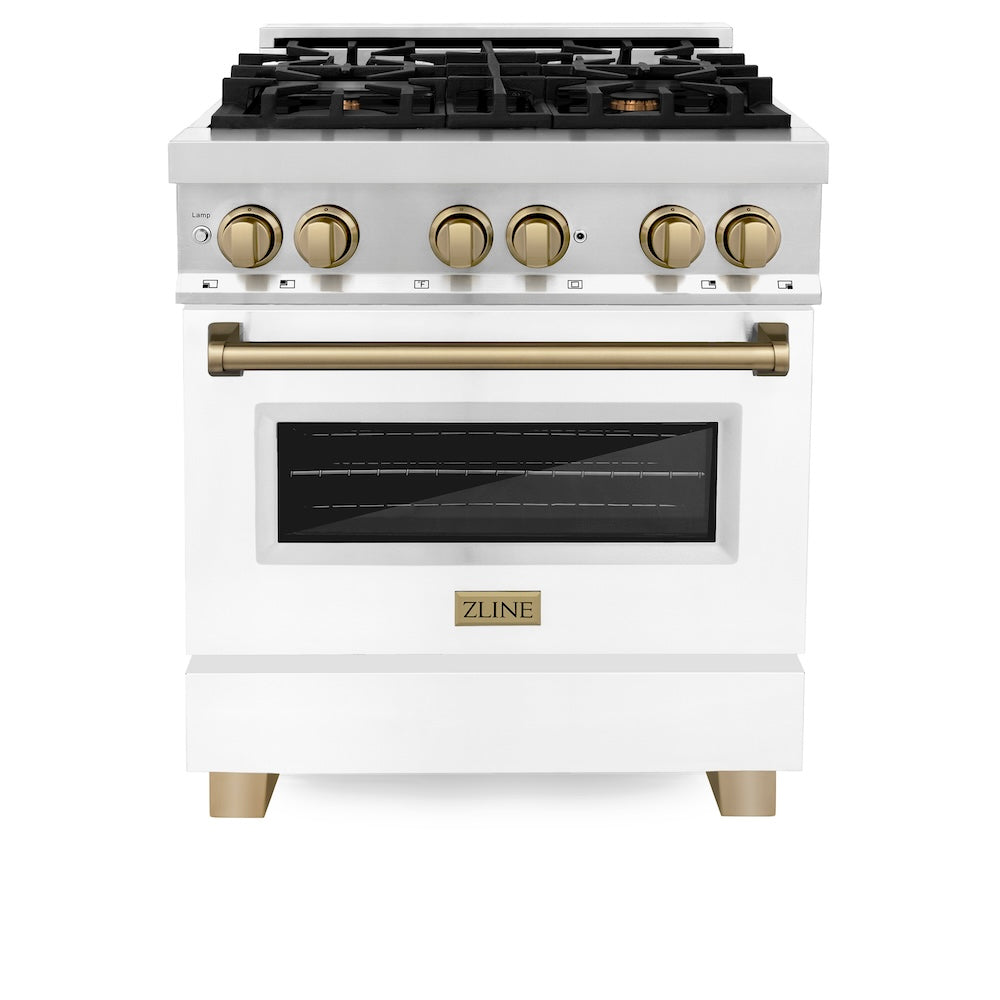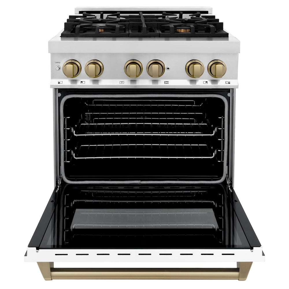 ZLINE Autograph Edition 30 in. 4.0 cu. ft. Legacy Dual Fuel Range with 4 Burner Gas Cooktop and Electric Convection Oven in Stainless Steel with White Matte Door and Champagne Bronze Accents (RAZ-WM-30-CB)