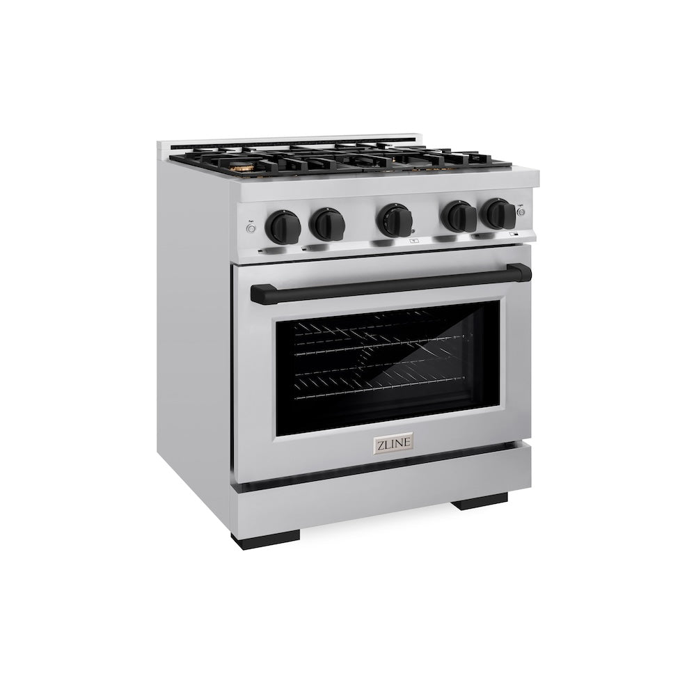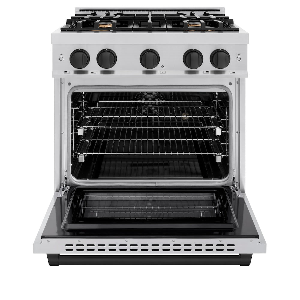 Luxury isn’t meant to be desired - it’s meant to be attainable. The ZLINE Autograph Edition 30 in. 4.2 cu. ft. Select Dual Fuel Range with 4 Burner Gas Cooktop and Electric Convection Oven in Stainless Steel with Matte Black Accents (HDRZ-30-MB) combines the elegance of a hand-finished porcelain gas cooktop with 4 Italian-made auto-reignition burners, an electric convection oven with an energy-efficient cooling fan to ensure quiet operation, a Horizon oven door window design, and stunning matte black knobs and handle allowing you to master every meal. With a modern, timeless style and refined functionality, ZLINE Select Dual Fuel Ranges are masterfully crafted to deliver an elevated culinary experience.