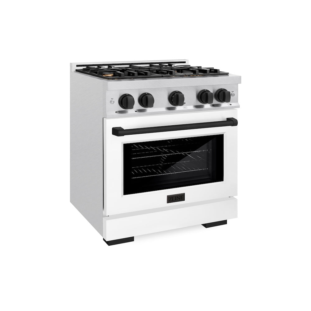 Luxury isn’t meant to be left desired—it’s meant to be attainable. The ZLINE Autograph Edition 30 in. 4.2 cu. ft. Select Gas Range with 4 Burner Cooktop and Convection Gas Oven in Satin Stainless Steel with White Matte Door and Matte Black Accents (HGRSZ-WM-30-MB) combines the elegance of a hand-finished porcelain gas cooktop with 4 Italian-made auto-reignition burners, a gas convection oven with an energy-efficient cooling fan to ensure quiet operation, a beautiful white matte door with a Horizon window design, and stunning matte black knobs and handle allowing you to master every meal. With a modern, timeless style and refined functionality, ZLINE Select Gas Ranges are masterfully crafted to deliver an elevated culinary experience.