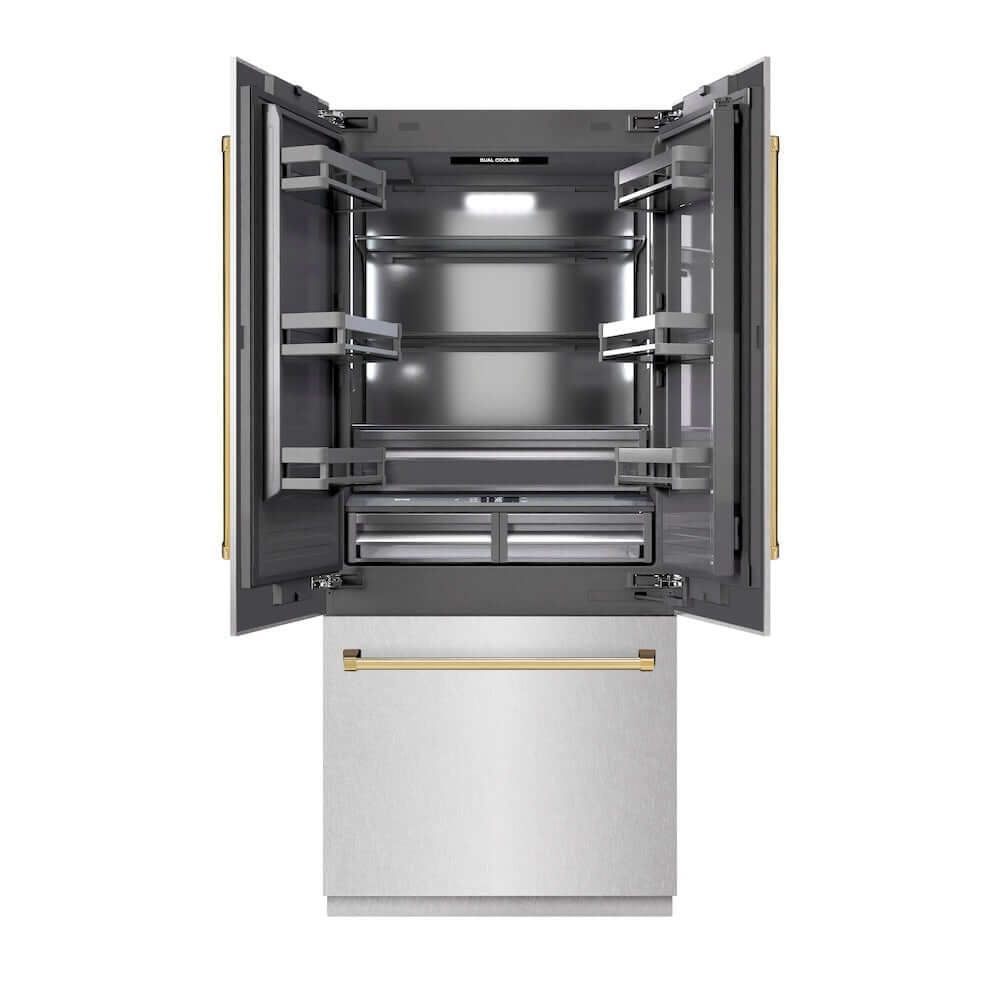 Luxury isn’t meant to be left desired—it’s meant to be attainable. The ZLINE Autograph Edition 36 in. 19.6 cu. ft. French Door Built-In Bottom Freezer Refrigerator with Water Dispenser and Ice Maker in Satin Stainless Steel with Graphite Gray Interior and Polished Gold Accents (GRBIVZ-SN-36-G) provides the ultimate upgrade to the center of your home by pairing premium dual cooling technology with enhanced storage capacity for multiple grocery items. Achieve ZLINE Attainable Luxury® excellence with innovative features designed to enhance your kitchen’s cooling and freezing capability.