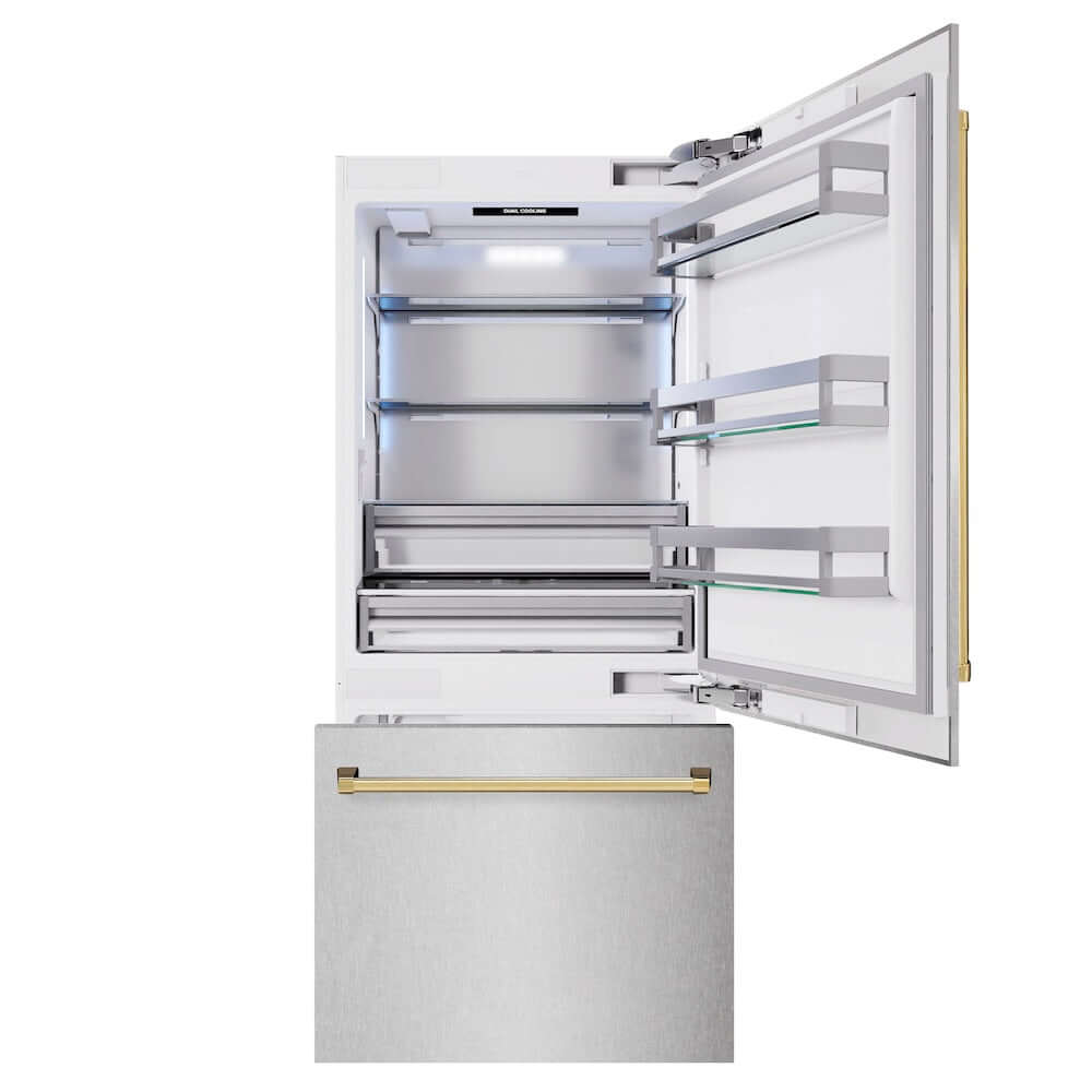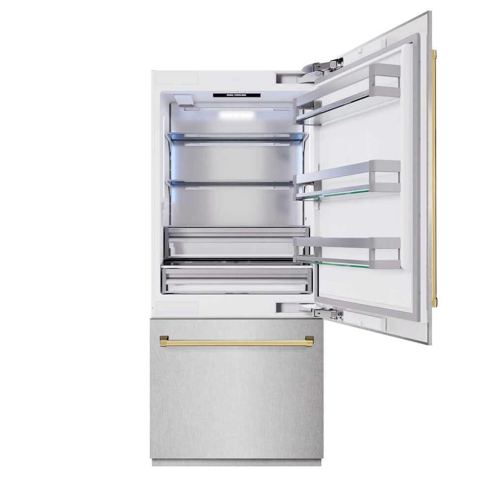 Luxury isn’t meant to be left desired—it’s meant to be attainable. The ZLINE Autograph Edition 36 in. 19.8 cu. ft. Built-In Bottom Freezer Refrigerator with Water Dispenser and Ice Maker in Satin Stainless Steel and Polished Gold Accents (RBITZ-SN-36-G) provides the ultimate upgrade to the center of your home by pairing premium dual cooling technology with enhanced storage capacity for multiple grocery items. Achieve ZLINE Attainable Luxury® excellence with innovative features designed to enhance your kitchen’s cooling and freezing capability.