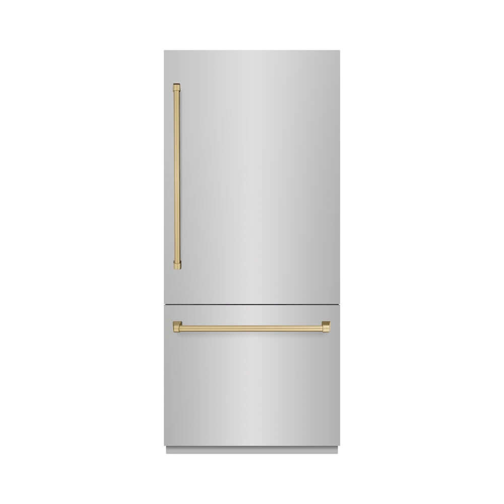 Luxury isn’t meant to be desired - it’s meant to be attainable. The ZLINE Autograph Edition 36 in. 19.8 cu. ft. Built-In Bottom Freezer Refrigerator with Water Dispenser and Ice Maker in Stainless Steel with Graphite Gray Interior and Champagne Bronze Accents (GRBITZ-304-36CB) provides the ultimate upgrade to the center of your home by pairing premium dual cooling technology with enhanced storage capacity for multiple grocery items. Achieve ZLINE Attainable Luxury® excellence with innovative features designed to enhance your kitchen’s cooling and freezing capability.