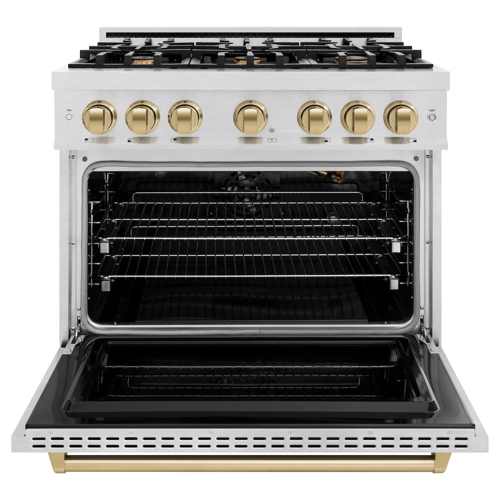 Luxury isn’t meant to be left desired—it’s meant to be attainable. The ZLINE Autograph Edition 36 in. 5.2 cu. ft. Classic Gas Range with 6 Burner Cooktop and Convection Gas Oven in Satin Stainless Steel and Champagne Bronze Accents (CGRSZ-36-CB) combines the elegance of a hand-finished porcelain gas cooktop with 6 Italian-made auto-reignition burners, a gas convection oven with an energy-efficient cooling fan to ensure quiet operation, a Landscape oven door window design, and stunning champagne bronze knobs and handle allowing you to master every meal. With a modern, timeless style and refined functionality, ZLINE Classic Gas Ranges are masterfully crafted to deliver an elevated culinary experience.