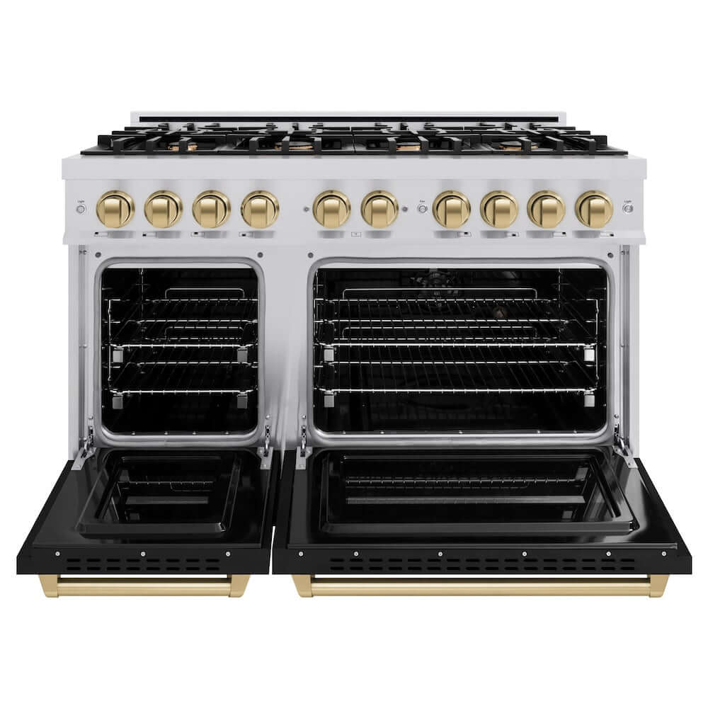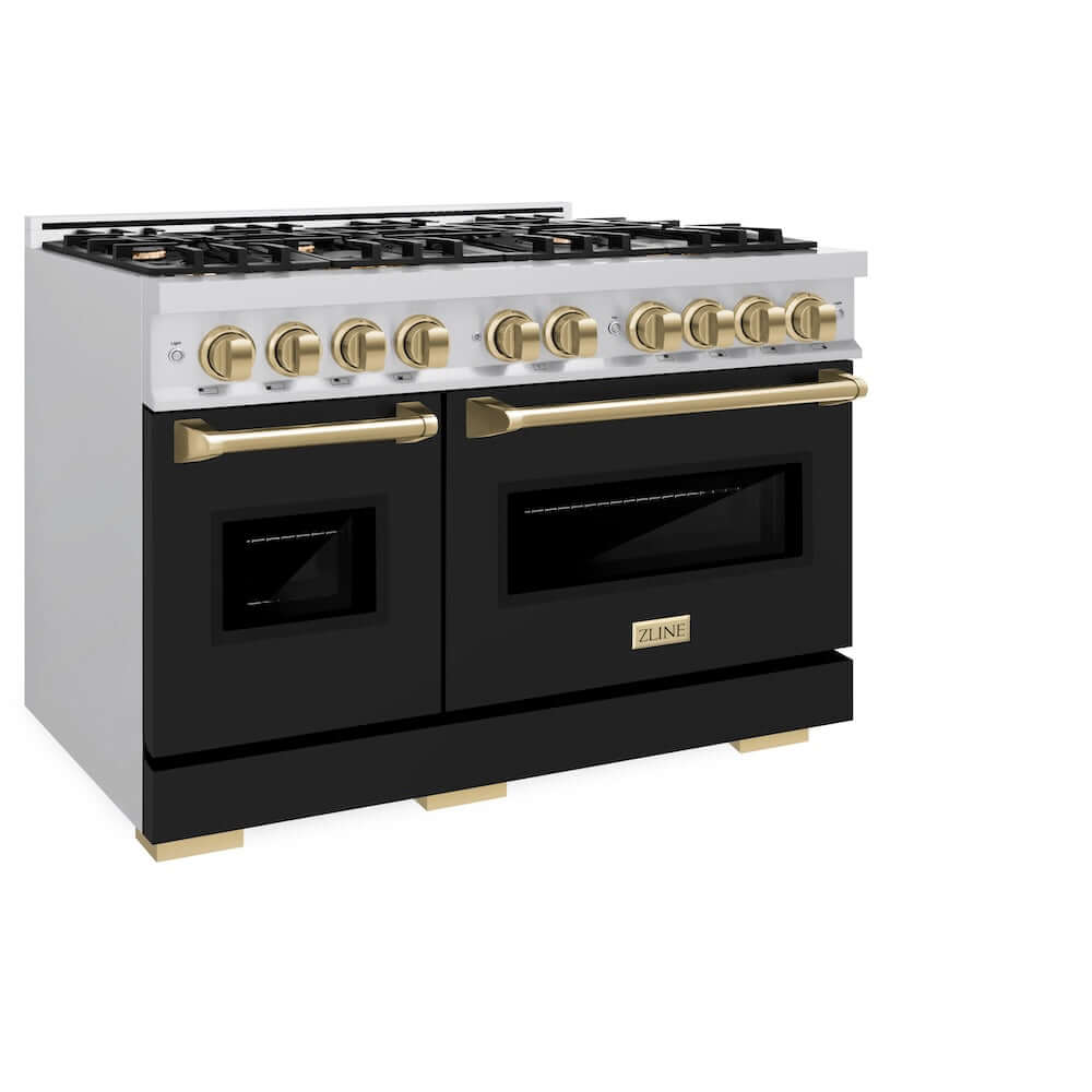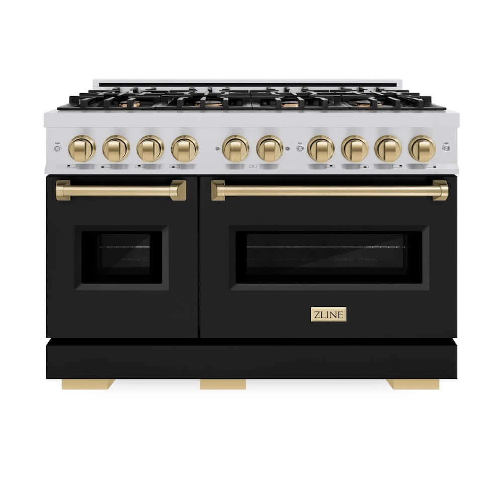 Luxury isn’t meant to be desired - it’s meant to be attainable. The ZLINE Autograph Edition 48 in. 6.7 cu. ft. Classic Double Oven Gas Range with 8 Burner Cooktop in Stainless Steel with Black Matte Doors and Champagne Bronze Accents (CGRZ-BLM-48-CB) combines the elegance of a hand-finished porcelain gas cooktop with 8 Italian-made auto-reignition burners, a large gas convection oven with an energy-efficient cooling fan to ensure quiet operation, a small baking oven, beautiful black matte doors with Landscape window designs, and stunning champagne bronze knobs and handles allowing you to master every meal. With a modern, timeless style and refined functionality, ZLINE Classic Gas Ranges are masterfully crafted to deliver an elevated culinary experience.