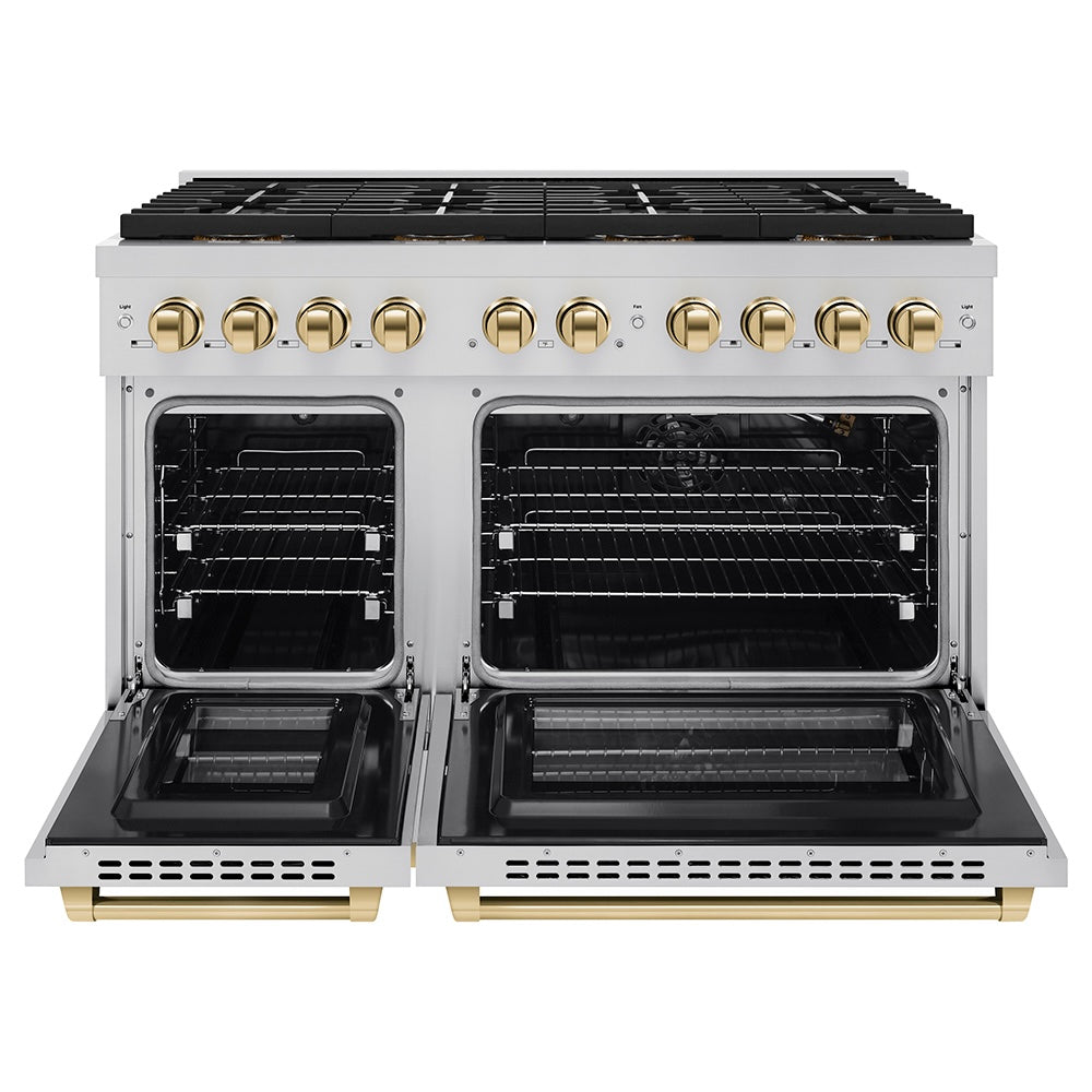 Luxury isn’t meant to be left desired—it’s meant to be attainable. The ZLINE Autograph Edition 48 in. 6.7 cu. ft. Paramount Gas Range with 8 Burner DuoPro™ Cooktop and Dual Ovens in Stainless Steel and Polished Gold Accents (PSGRZ-48-G) features a high-powered gas cooktop with 8 hand-crafted Italian dual-ring brass burners and a versatile gas convection oven allowing you to master every meal. Double your cooking power on every burner with a DuoPro™ Cooktop that delivers ultimate flame control flexibility and unprecedented culinary confidence.