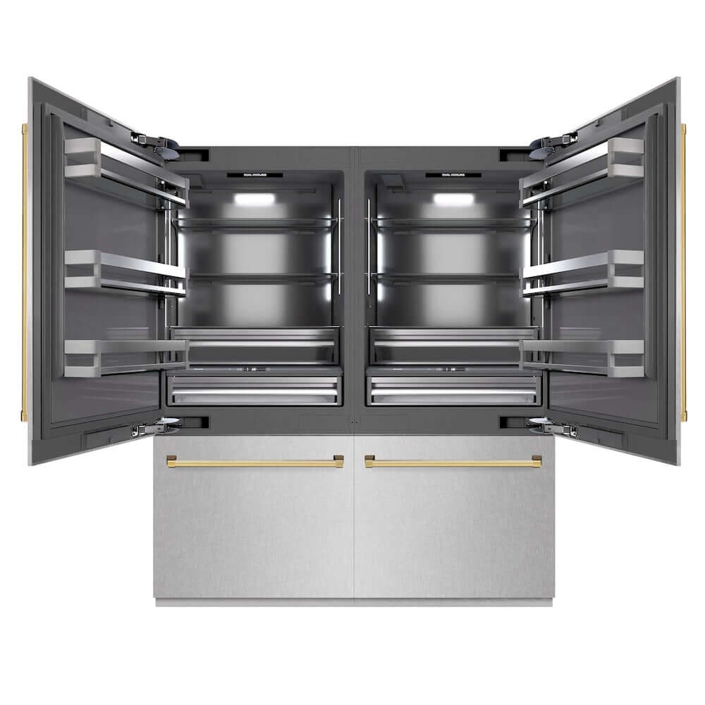 Luxury isn’t meant to be left desired—it’s meant to be attainable. The ZLINE Autograph Edition 72 in. 39.6 cu. ft. French Door Built-In Bottom Freezer Refrigerator with Water Dispensers and Ice Makers in Satin Stainless Steel with graphite Gray Interior and Polished Gold Accents (GRBITZ-SN-72-G) provides the ultimate upgrade to the center of your home by pairing premium dual cooling technology with enhanced storage capacity for multiple grocery items. Achieve ZLINE Attainable Luxury® excellence with innovative features designed to enhance your kitchen’s cooling and freezing capability.