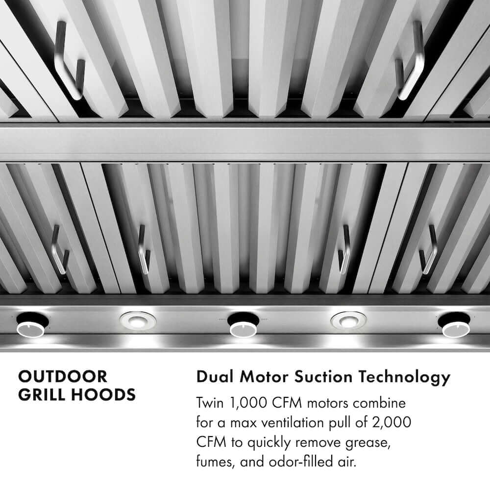 - Dual Motor Suction Technology - Twin 1,000 CFM motors combine for a max ventilation pull of 2,000 CFM to smoothly move grease, fumes, and odor-filled air away from your outdoor cooking area